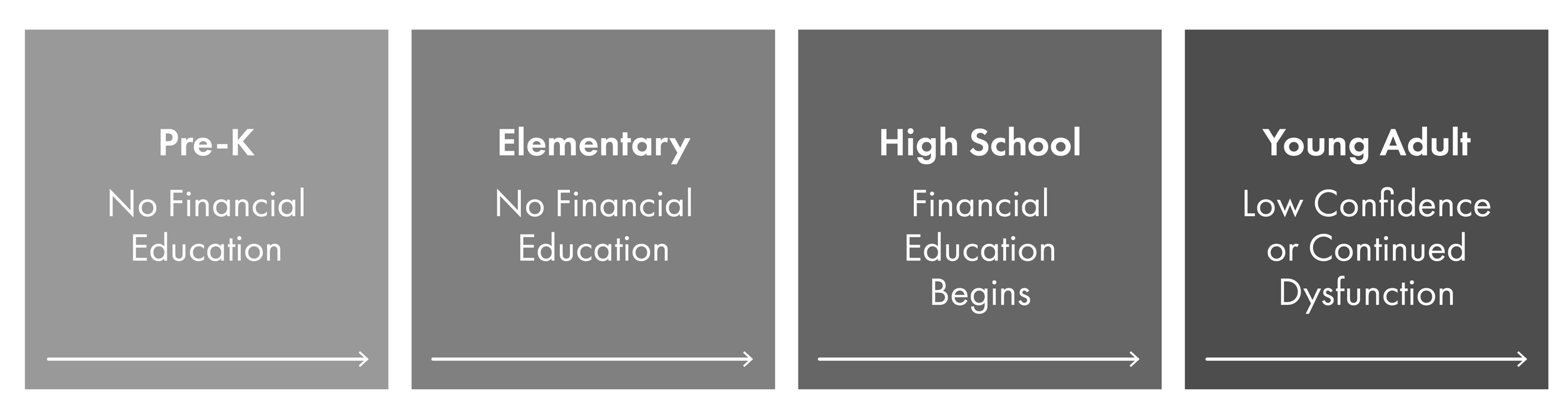 Innovation #3. And a small cadre of us are doing our best to spark a third innovation, Financial Readiness for Young Children. 47% of adults report being financially illiterate. But given the embarrassment I note among adults who fess up to this, I suspect the reality is far higher. And why would it not be? The financial landscape is ever more complex and innovations in financial education have been few and far behind (other than moving it online, which has had insignificant impact). And, as the following chart shows, what exists is largely about repairing, not preparing; ‘fixing kids’ when they’re felt to be spending too much, in credit card trouble, or just oblivious to the role of financial responsibility in their lives.